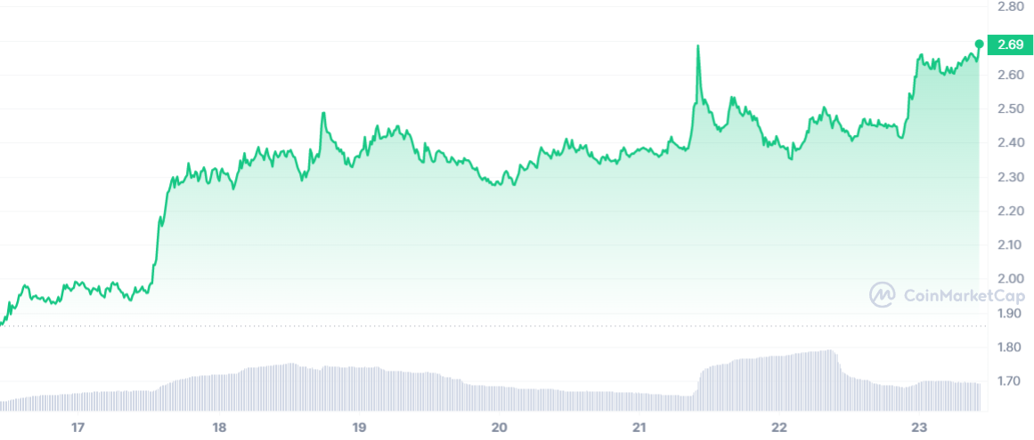 Malgré des mèches impressionnantes sur Binance (aux alentours des 2,90 $), le RNDR est pour le moment bloqué aux 2,70 $. Cependant, vu la dynamique actuelle de cette crypto, cela pourrait très bien n’être que partie remise. Aujourd’hui, le cours RNDR est en hausse de 9,75 % et s’échange à 2,69 $. Le jeton peut-il aller voir plus haut demain ?