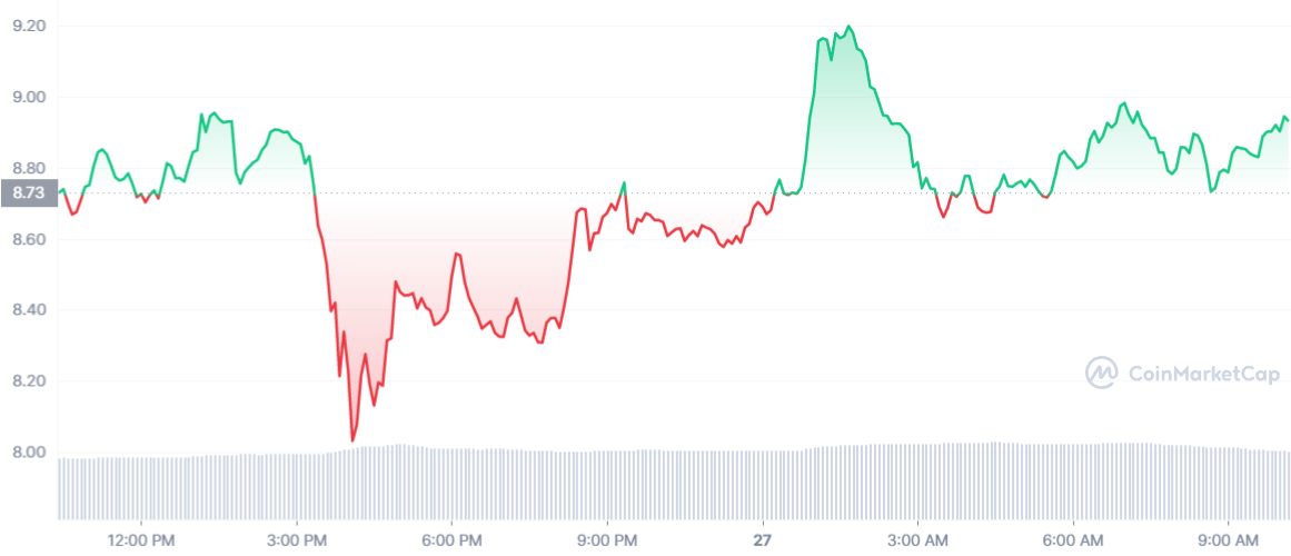 Même si aujourd’hui la hausse est plus nuancée, la crypto 📈 INJ se place à la troisième place. Les fortes hausses, aussi sauvages que retentissantes seront remises à une prochaine fois ; en attendant, le cours INJ est tout de même en hausse de 3,20 %. Quant au prix de la pièce, il flirte à nouveau avec les 9 $ : 8,97 $ au moment de rédaction.