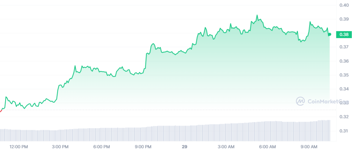 Le cours CFX se retrouve donc à nouveau à un prix d’échange de 0,38 $. Le jeton est en hausse sur les dernières 24 heures de 17 %. Une première place en belle et due forme !