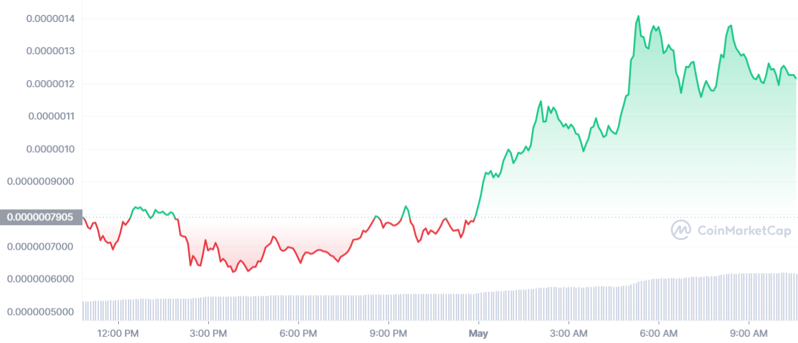 En hausse de plus de 100 % plus tôt dans la journée, le cours PEPE s’est un peu replié pour être désormais en croissance de “seulement” 55 % sur la journée. Toutefois, la performance reste exceptionnelle et surtout la meilleure de la journée.