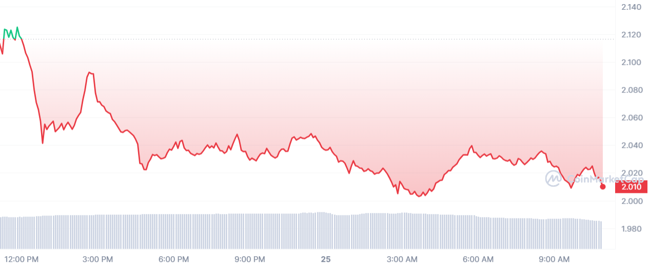 Aujourd’hui, c’est encore tout faux pour le jeton APE, qui en paye immédiatement les pots cassés. Au moment de rédaction, le cours est proche de perdre les 2 $ après une nouvelle chute de 4,75 %.