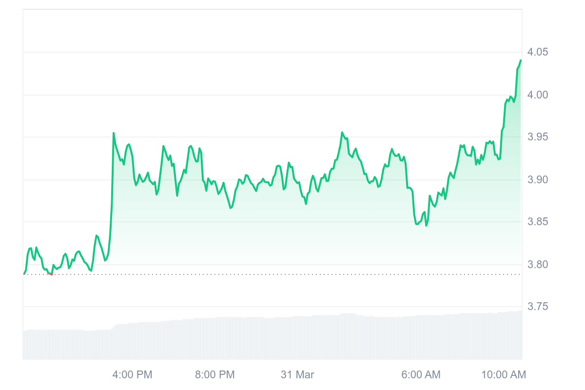 Le jeton est cette fois-ci encore dans le vert et dépasse par la même occasion les 4 $. Oui, le Toncoin confirme qu’il remonte et se négocie maintenant à 4,04 $ (+6,30 %).