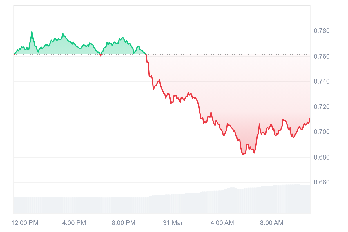 Le PI de Pi network est dans le rouge, avec une performance donc fortement négative. Il n’y a pas grand monde qui fait pire avec un retracement de 6,94 % qui fait retomber l’actif à la limite inférieur des 70 centimes.