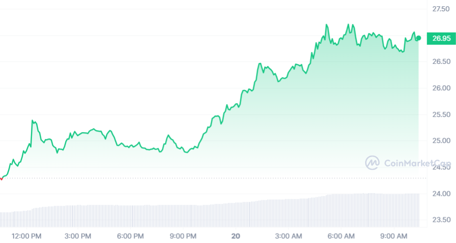 Sur la journée, le cours SOL a gagné 11,01 %, et grâce à ce rythme impressionnant, le jeton flirte avec les 27 $.