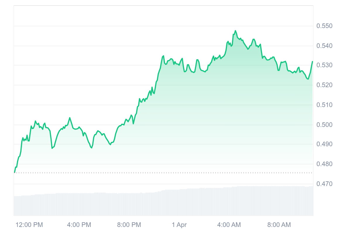 Le cours du CRV fait sa journée de A à Z dans le vert avec un gain de 11,76 %. Cette belle performance permet à la pièce de Curve de se négocier à 0,531 $.