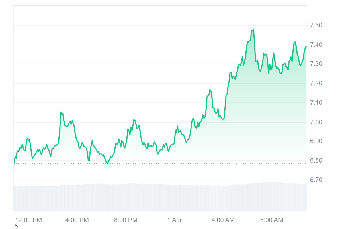 Le BERA se satisfait d’une nouvelle journée qui se sera déroulée dans le vert. Elle se termine de la meilleure des manières, avec un gain de 9,20 % qui pourrait dépasser rapidement les 10 %. La pièce de Berachain se négocie maintenant à 7,43 $.