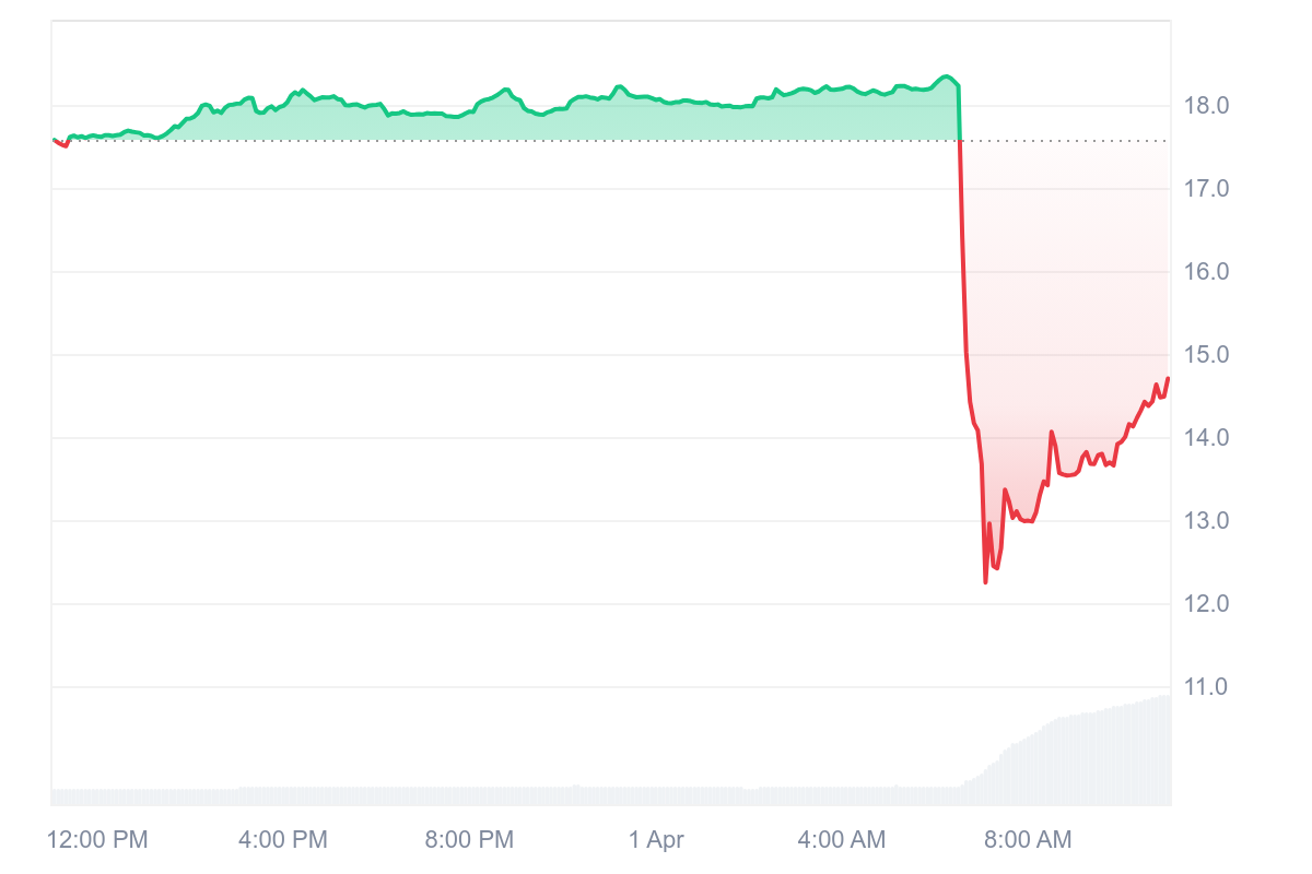 Le DEXE a ainsi essuyé un très lourd revers après cette perte de hauteur significative chiffrée à 16,42 %. Le token est retombé temporairement à 12 $ et s’échange maintenant à 14,70 $.