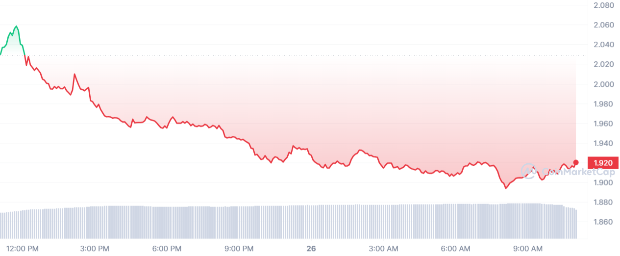 Le cours LDO a progressivement dégringolé sur les dernières 24 heures. En conséquence, après cette baisse de 5,97 %, le jeton est repassé sous les 2 $. Actuellement, le prix d’échange de chaque pièce est de 1,92 $.