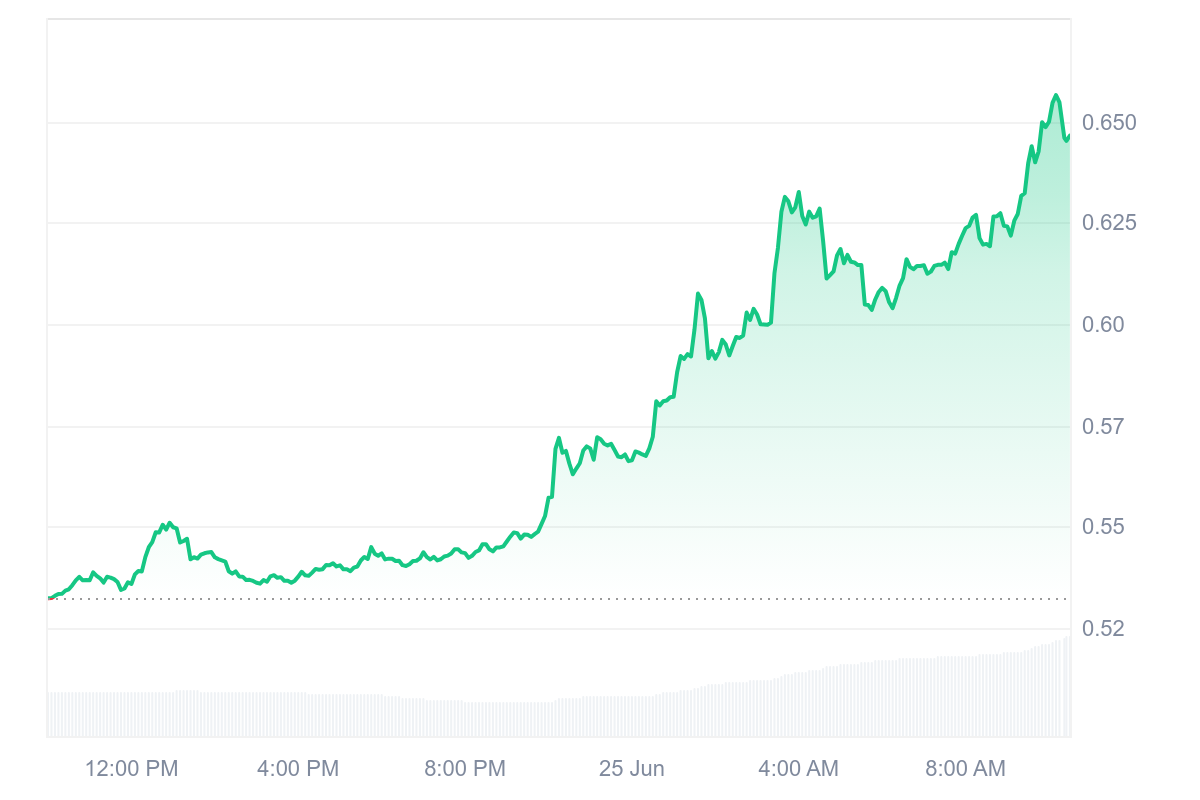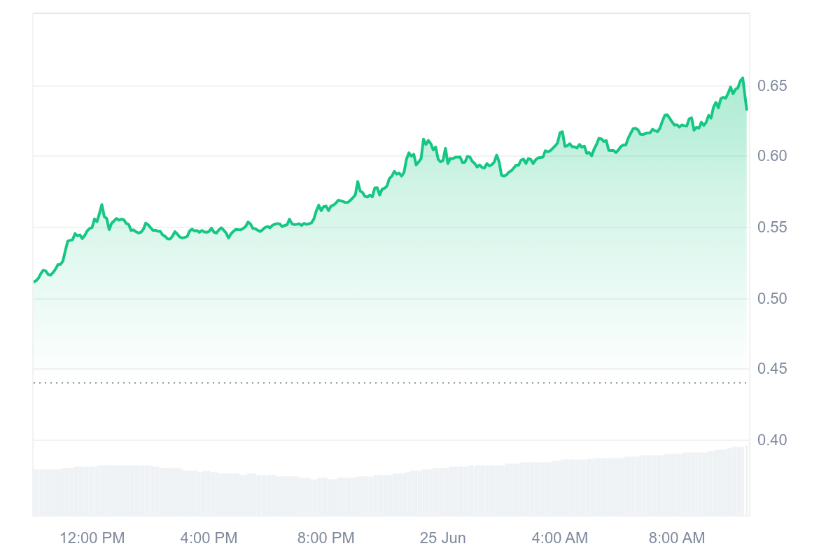 Le cours du SYRUP est dans le vert au moment de rédaction après avoir passé la journée à grimper. La hausse sur les dernières 24 heures est impressionnante : 22,33 % de gains et un prix de 0,63 $ au moment de la rédaction.