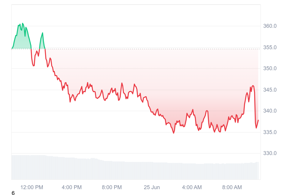 Le TAO est finalement dans le rouge après son sursaut haussier de la veille et perd 6 %. Cette mésaventure fait retomber le prix à 338,64 $.