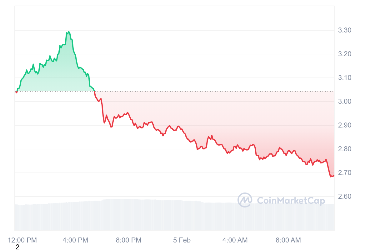 Le retracement est significatif pour Raydium et aussi pour Jito, avec un JTO en baisse de plus de 10,39 %. L’actif perd les 3 $ en se négociant actuellement à 2,72 $.