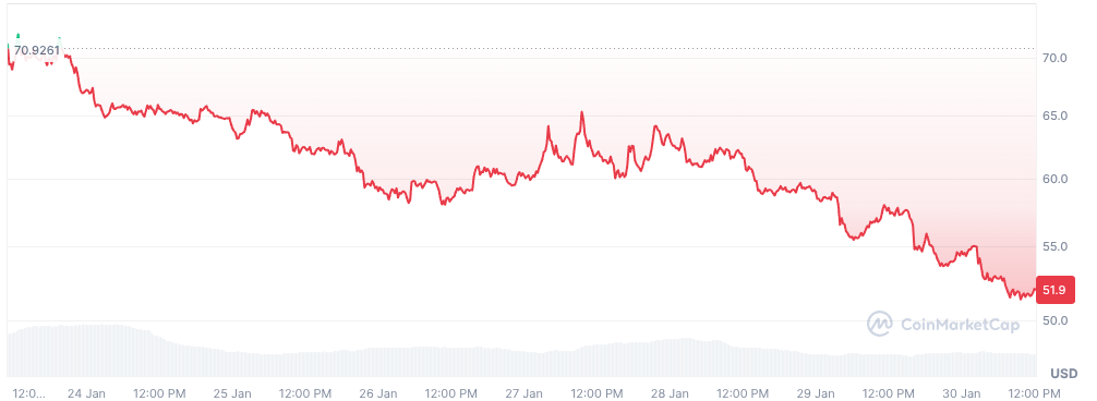 L’Unité d’Intelligence Financière de l’Inde a signalé Dash pour des préoccupations AML, alimentant les craintes de délisting et plombant le sentiment des investisseurs. Les ventes concentrées de baleines, un biais short dominant dans les dérivés avec un intérêt ouvert record et la cassure du support clé à 70 $ ont amplifié les liquidations.