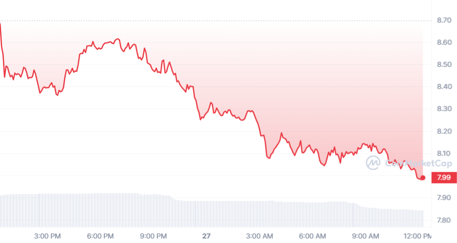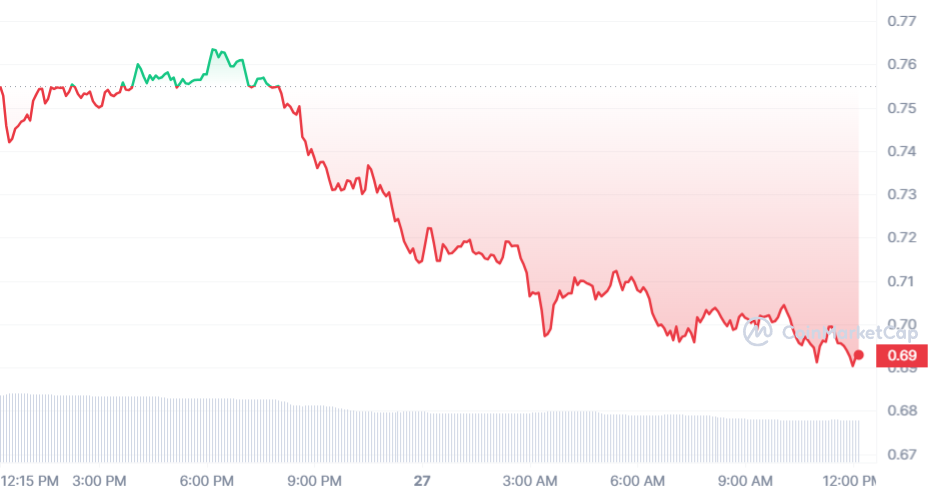 Le cours MINA est le deuxième perdant du jour, avec une baisse de 8,24 % sur les dernières 24 heures. Au moment de rédaction, après avoir dégringolé progressivement, le cours MINA est de 0,69 $.
