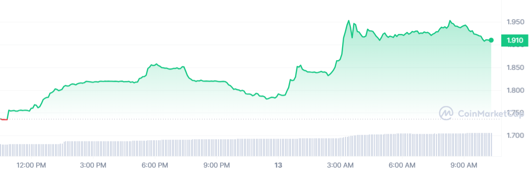 Le cours TON arrive cette fois à dépasser les 10 % de hausse (10,24 %). Cette évolution plus que positive permet à la pièce de dépasser les 1,91 $.