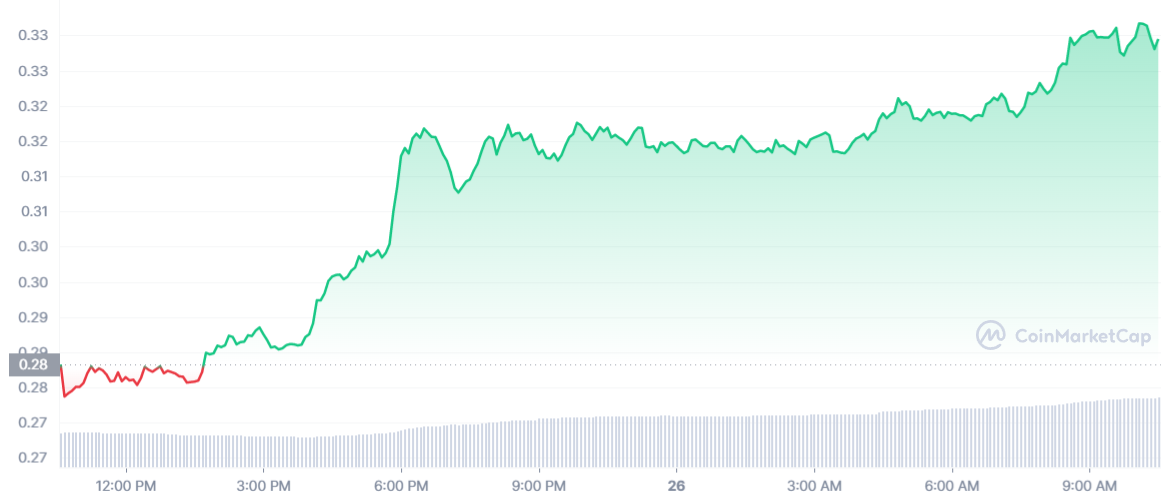 C’est chose faite aujourd’hui, avec un cours CFX en hausse de 16,25 % sur les dernières 24 heures. La crypto s’échange à 0,33 $, de beaux progrès ayant été faits.