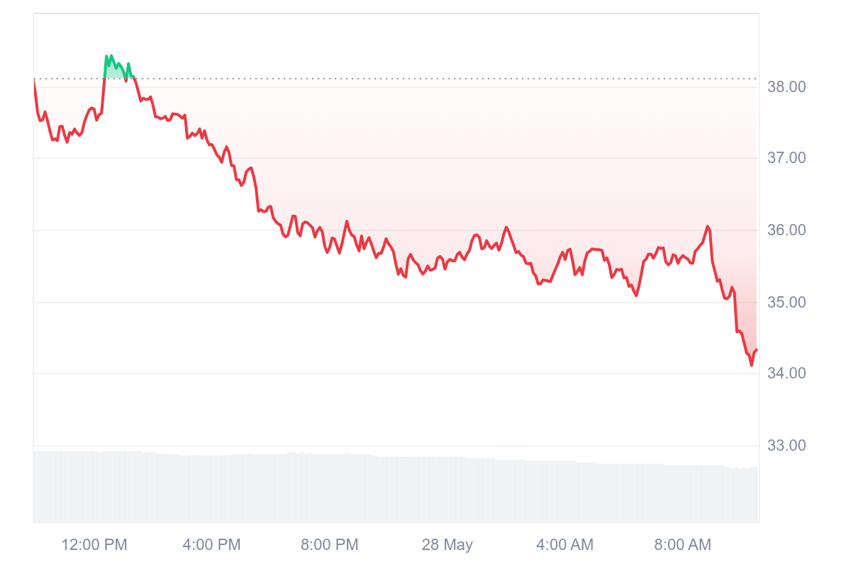 Le jeton réussite du mois de mai remet le coup aujourd’hui avec un retracement de 7,89 % qui est plus difficile à encaisser que celui de la veille. Malgré tout, le jeton reste bien installé au-dessus des 34,32 $.