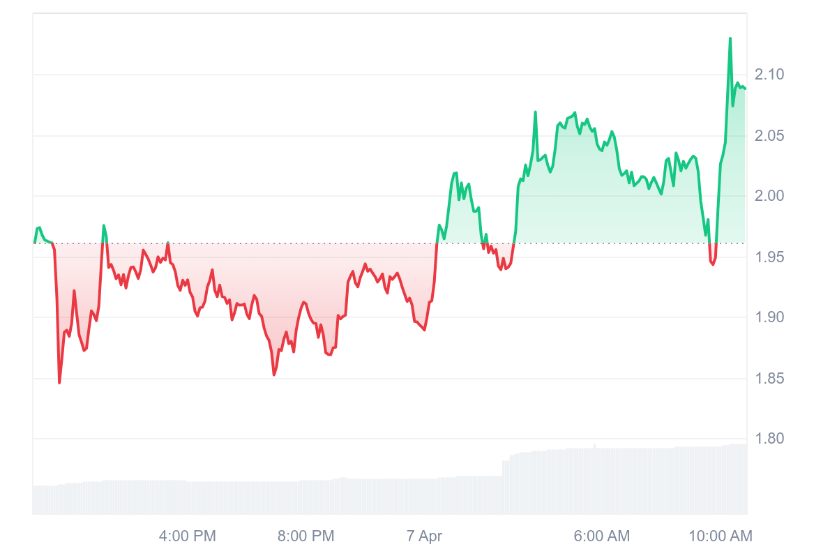 Il limite plutôt bien la casse, en restant au-dessus des 2 $ au moment de rédaction tout en profitant d’une hausse supérieure de 6,29 %. La pièce se négocie maintenant à 2,08 $.
