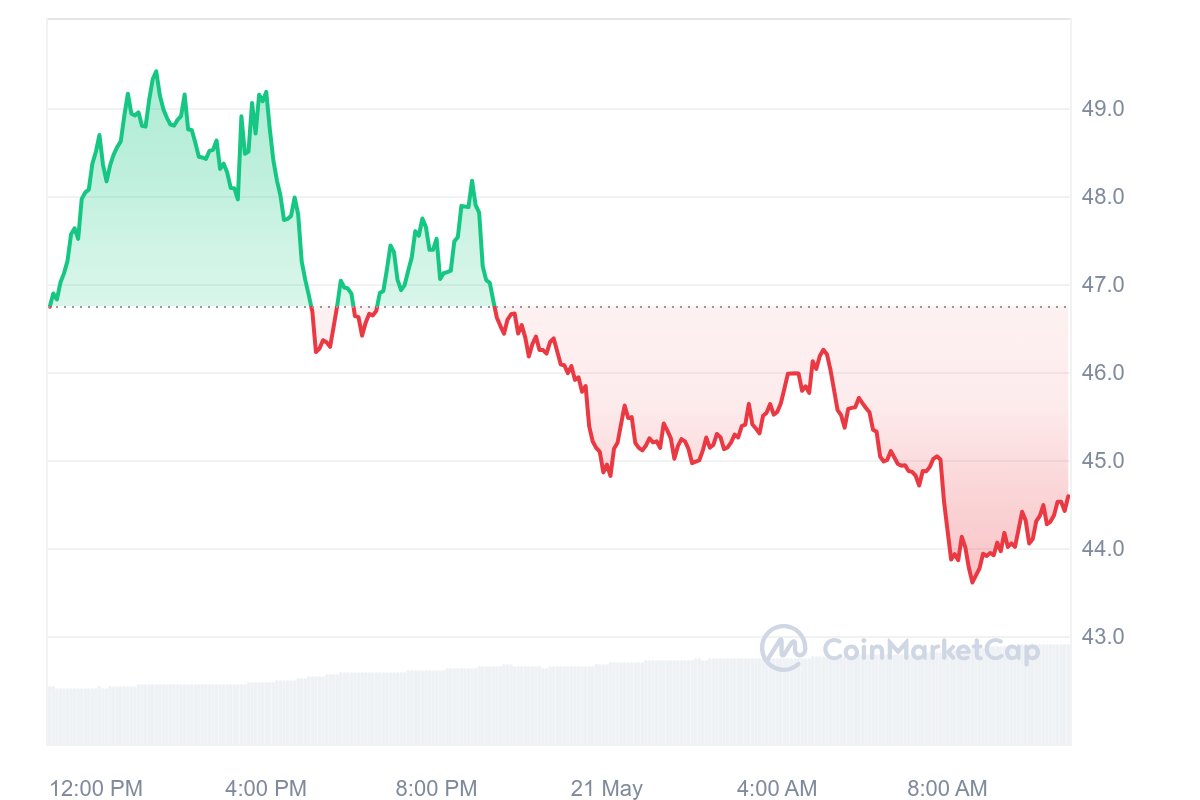 SponsoredLa performance a beau être mitigée, ce n’est pas non plus catastrophique. En effet, puisque le jeton AR est en baisse de “seulement” 4,58 %. Cependant, cela fait tâche alors que le marché crypto a explosé. Proche des 50 $, le cours du jeton est retombé à 44,59 $.