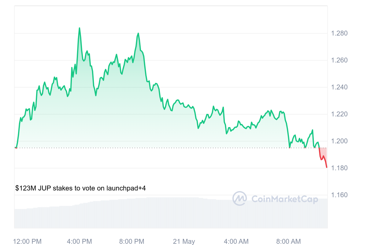 Cependant, au fil des heures, tant Solana comme Jupiter ont perdu des forces et maintenant, le JUP est même du côté des flops du jour. En perdant 1,31 %, le prix du JUP est retombé à 1,18 $.