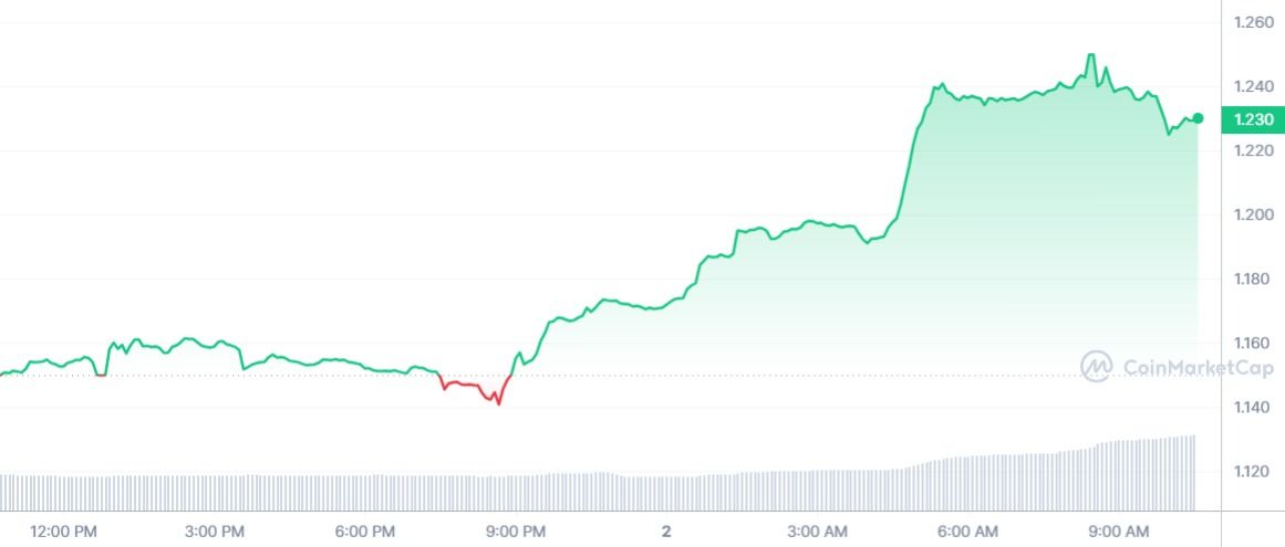 Le cours ARB voit donc sa valeur augmenter de 6,80 % aujourd’hui. Le jeton s’éloigne davantage encore du dollar, et atteint les 1,23 $. Toutefois, avec ARB, le mouvement pourrait rapidement s’estomper si le reste du marché crypto (surtout Bitcoin) ne vient pas soutenir la tendance.