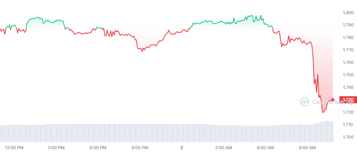 En conséquence, le cours 👍 TON est de nouveau en baisse. Le jeton s’échange maintenant à un prix de 1,73 % après avoir vu son cours baisser de 3,18 %.
