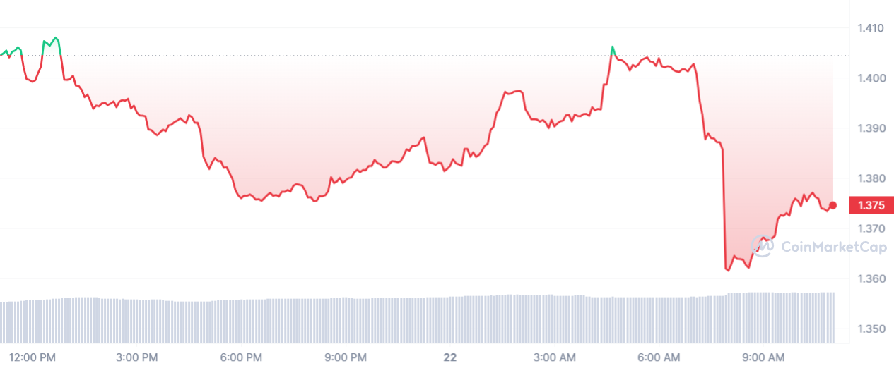 Finalement, la pièce TON est deuxième loser du jour, et perd même 2,18 % en 24 heures. Maintenant, le prix actuel d’échange est de 1,37 $.
