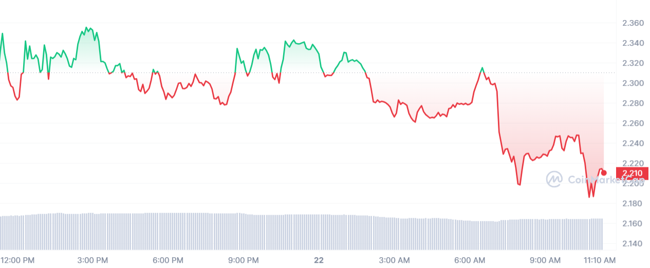 Le cours RNDR est en baisse de 2 % au moment de rédaction, avec un cours d’échange de 2,21 $.