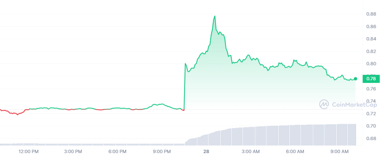 Le cours IMX est finalement en hausse de 7,18 % sur la journée. Même si le jeton aurait pu espérer mieux avec un sommet local aux alentours des 0,88 $, la pression est tout doucement redescendue. Malgré tout, la crypto est tout de même en hausse avec un prix actuel de 0,78 $.