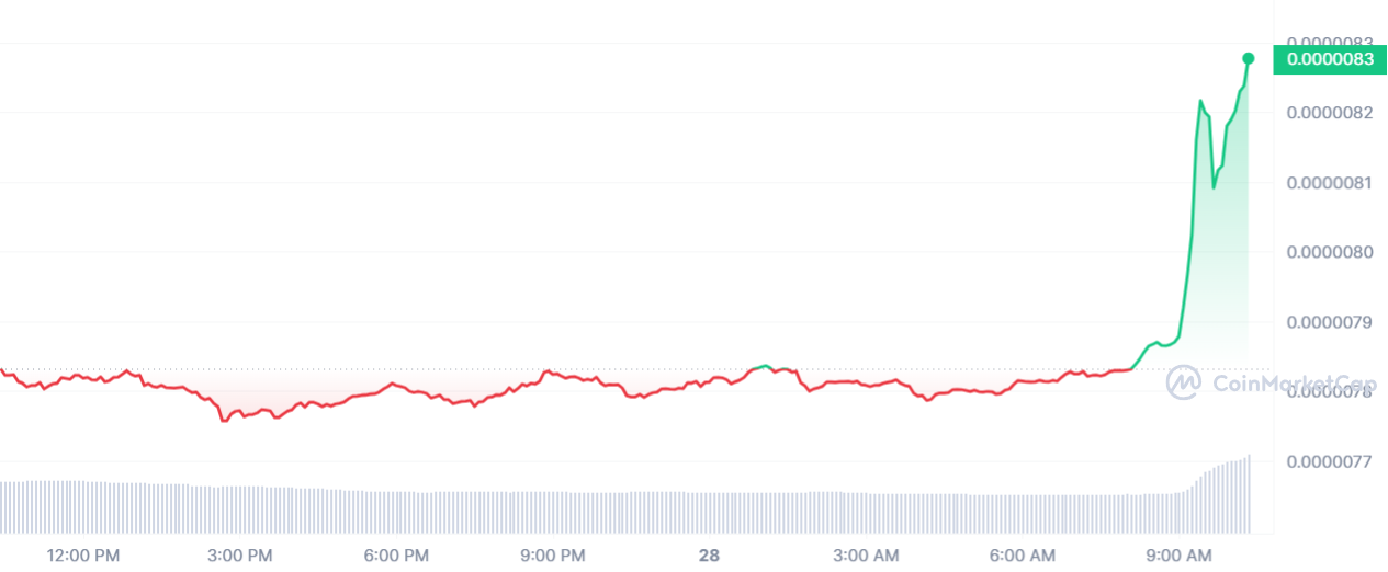 Au cours de ces dernières 24 heures le jeton SHIB de la crypto Shiba Inu a gagné 5,90 %. Désormais, la pièce équivaut à 0,0000083 $.