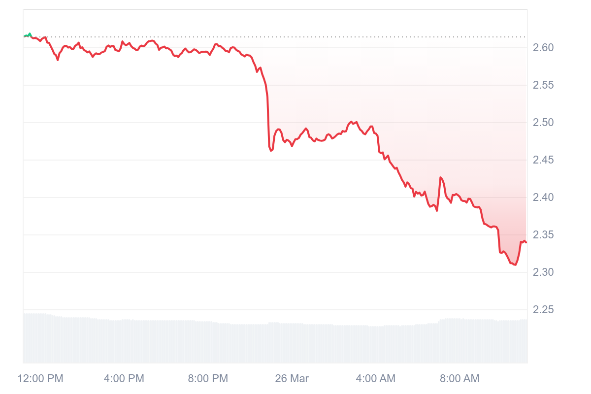 Malheureusement, c’est une forte baisse qui est au programme du jour pour le CAKE avec un jeton qui recule et recule encore. Les performances sont négatives et l’incidence sur le prix également. Résultat des courses, le CAKE se négocie à 2,34 $ après les conséquences d’une chute supérieure à 10 %.