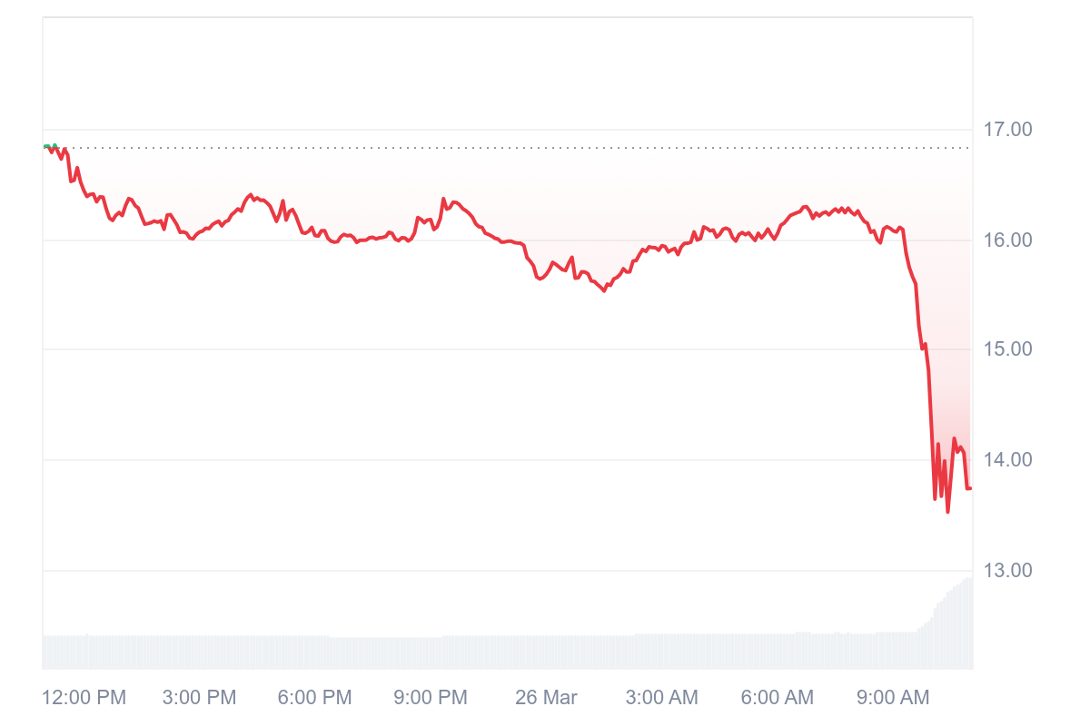 Le cours du HYPE ne se réjouit pas du tout du résultat journalier en raison de cette chute de 23,03 % qui fait passer le HYPE de plus de 16 $ à moins de 13 $. Le tout, en une seule journée seulement et sans grosse agitation du BTC.
