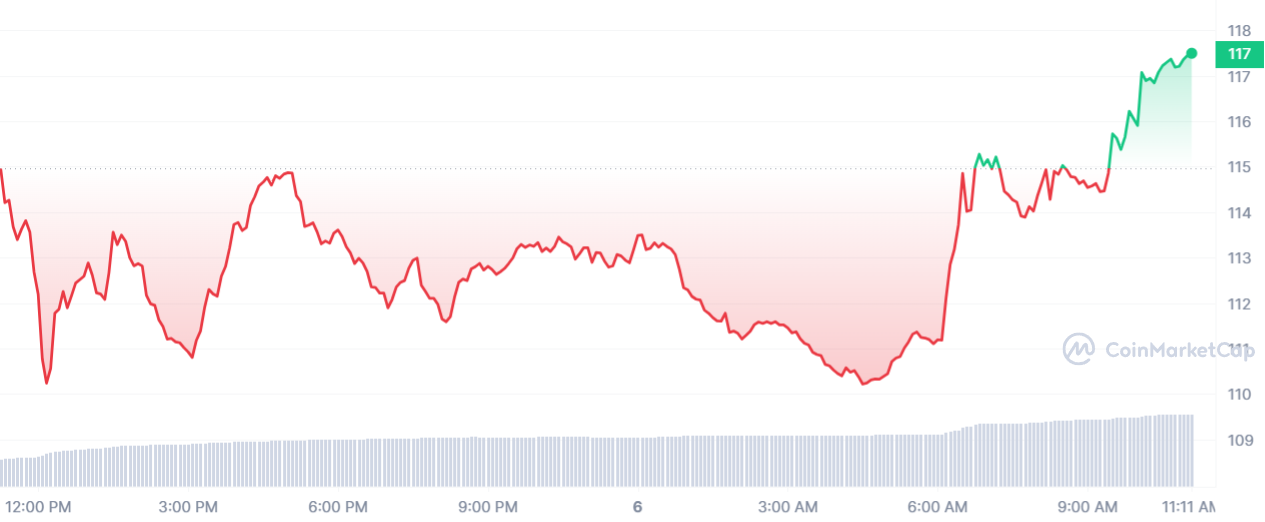 En conséquence, le cours 🥉 QNT est en hausse de 2,07 % aujourd’hui, suffisant pour s’accrocher à la troisième place. Le prix de chaque pièce Quant est de 117,56 $.