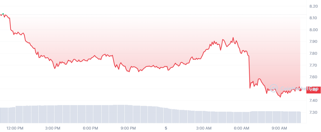 En conséquence, le cours APT retombe sous les 8 $. Désormais, la crypto d’Aptos à un prix de 7,49 $ après une baisse de 7,91 % sur les dernières 24 heures.