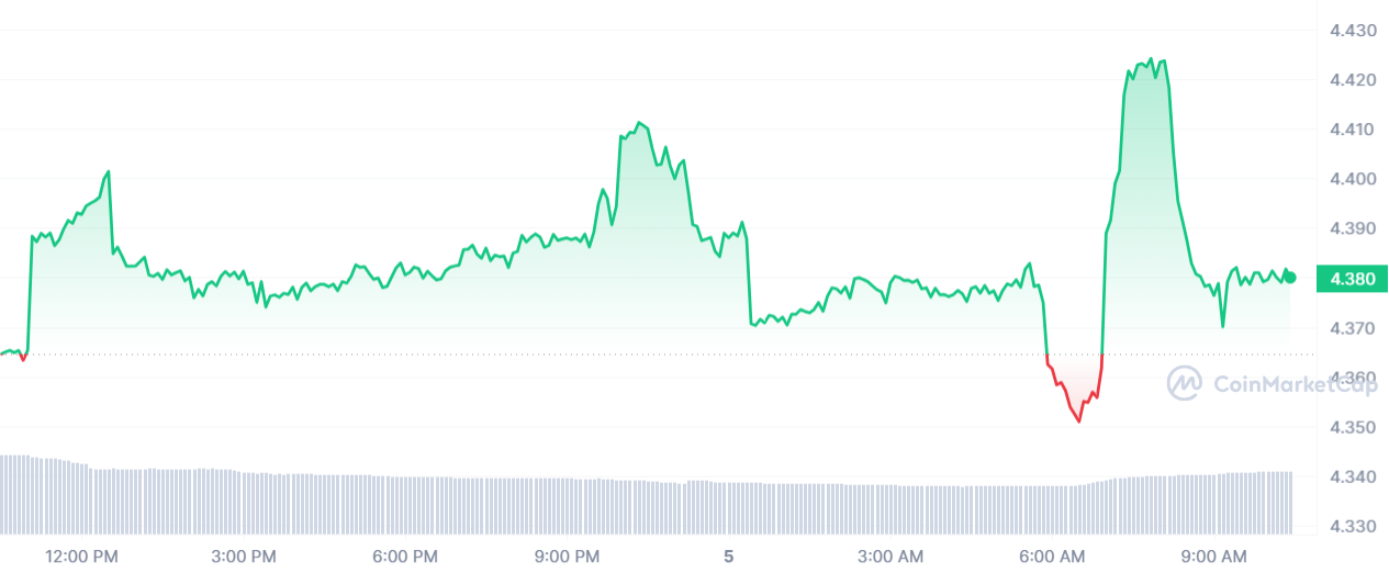 Le cours du jeton GT connait aujourd’hui une hausse plus que modérée de 0,40 %. Désormais, le GateToken s’échange à un prix de 4,38 $.