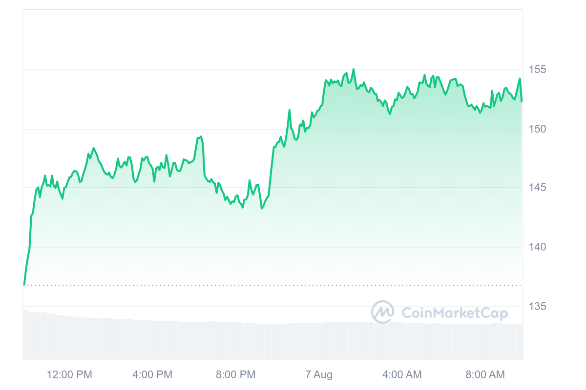 Le SOL de Solana se rassure une journée de plus avec un actif qui accélère avec un gain de 11,29 %. Cette évolution plus que positive permet à l’actif de s’échanger à 152,28 $.