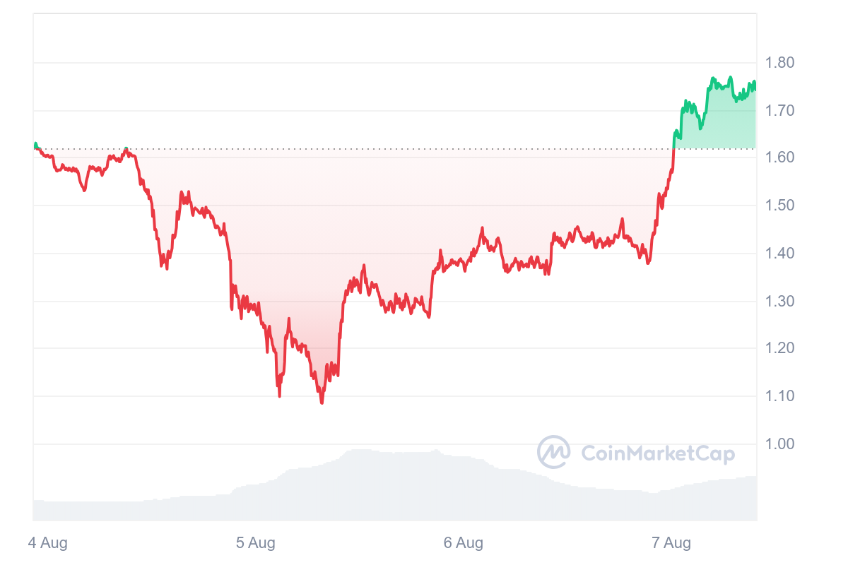 Le WIF sort enfin de sa période négative avec plus de 28 % de gagnés aujourd’hui ! En conséquence, le prix de l’actif se revalorise fortement et s’éloigne du dollar pour se rapprocher des deux dollars.