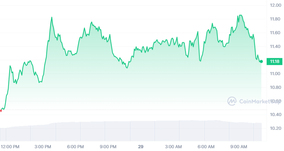 Avec une nouvelle hausse de 7,16 % aujourd’hui, le jeton TIA de Celestia se maintient au-dessus des 11,18 $. Le temps d’un instant, la pièce de Celestia s’est même rapprochée des 12 $.