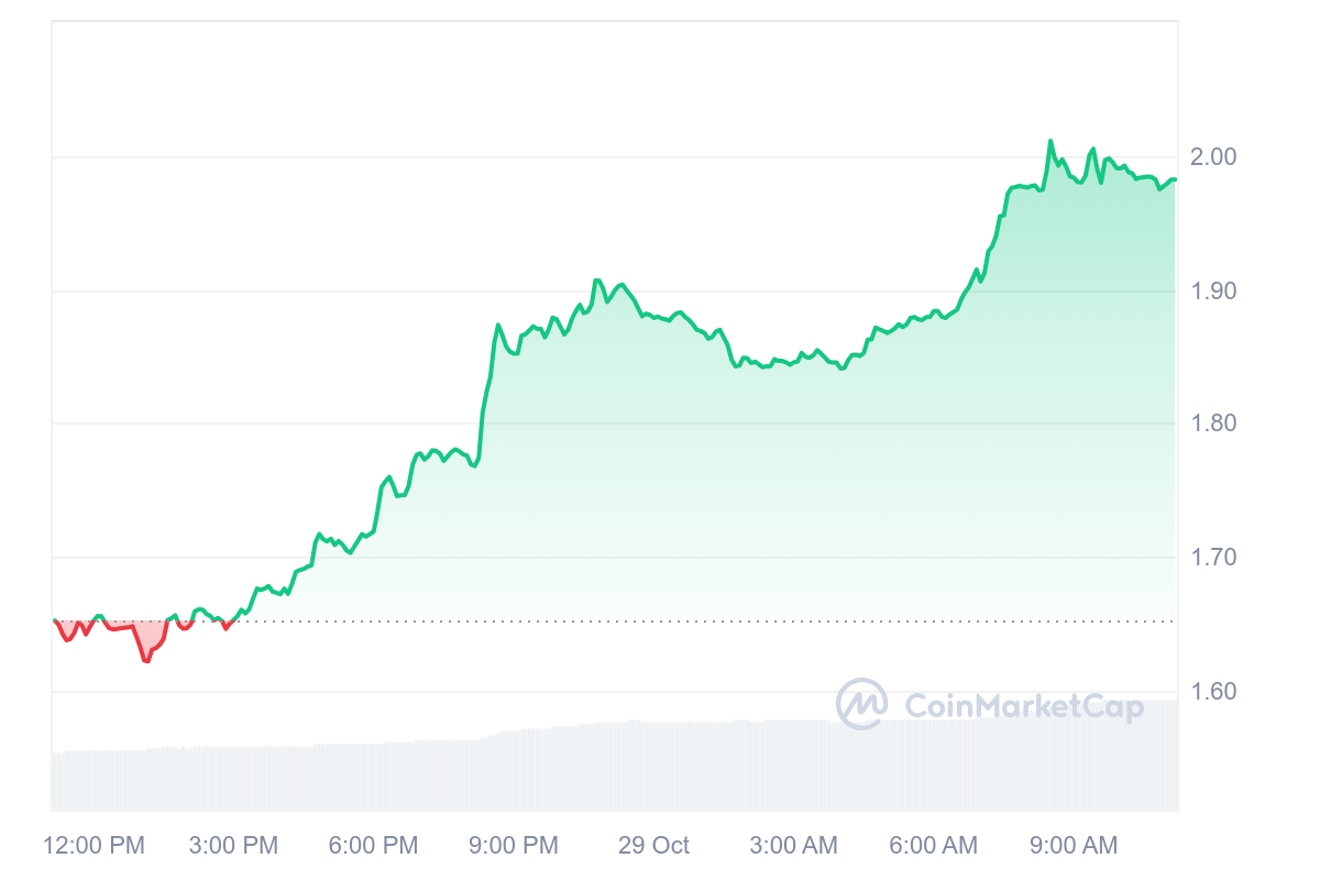 Le cours du SUI est en forte hausse ce mardi avec un gain journalier supérieur à 20 %. Désormais, l’actif frôle à nouveau avec les 2 $ et un ATH ne parait désormais plus si loin (16 %).
