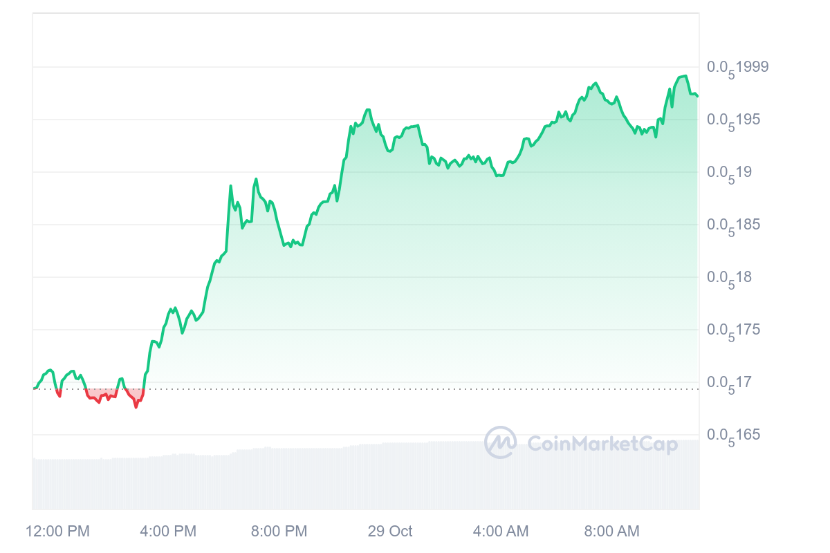 Le MOG est le grand gagnant de la catégorie meme coins avec un gain impressionnant de 16,35 %. Désormais, le jeton s’échange à 0,0000019 $.