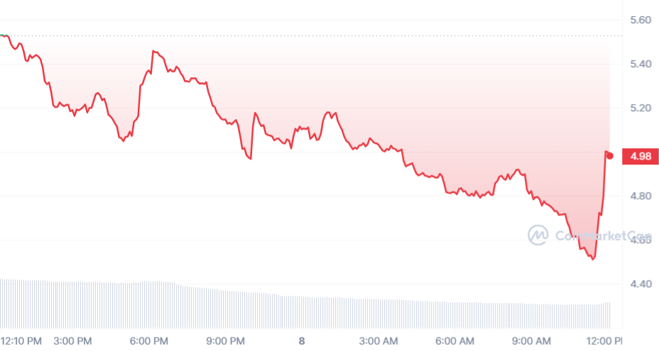 SponsoredDésormais, le cours HNT est repassé sous les 5 $ avec un prix de 4,98 $. La baisse s’est fait ressentir, avec une chute de 9,15 %.