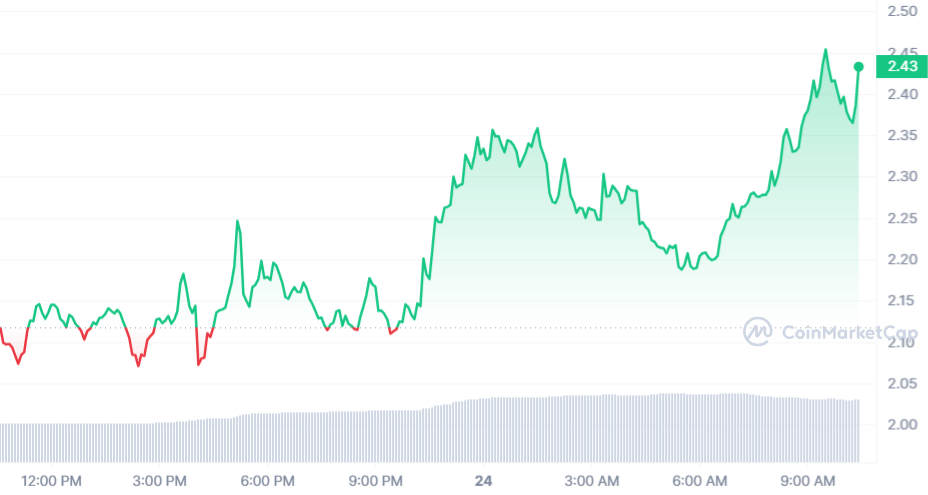 Sur la journée, le cours du LDO est en hausse de 15,11 % avec une hausse qui s’est renforcée au moment de rédiger ce top & flop crypto. La pièce s’échange désormais à 2,43 $.