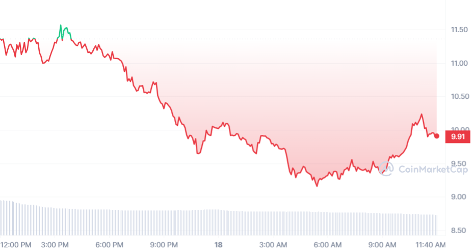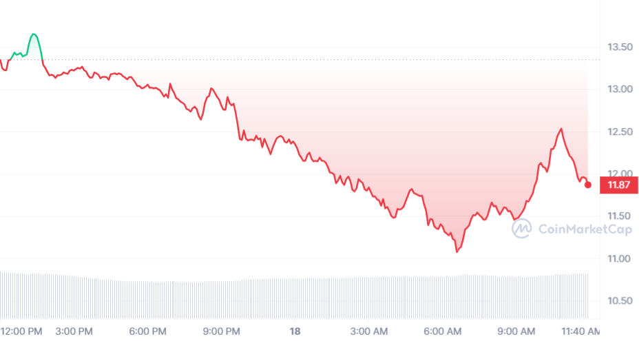 Le cours Celestia a tout de même remonté après une mèche inférieure à 11 $. Malgré la baisse sévère de 11,24 %, le prix se maintient à 11,87 $.