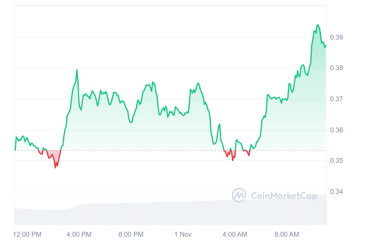 Le cours ENA se revalorise et s’échange désormais à un prix de 0,387 $. C’est le seul altcoin qui frôle les 10 % de hausse aujourd’hui avec une évolution plus que positive de 9,30 %.