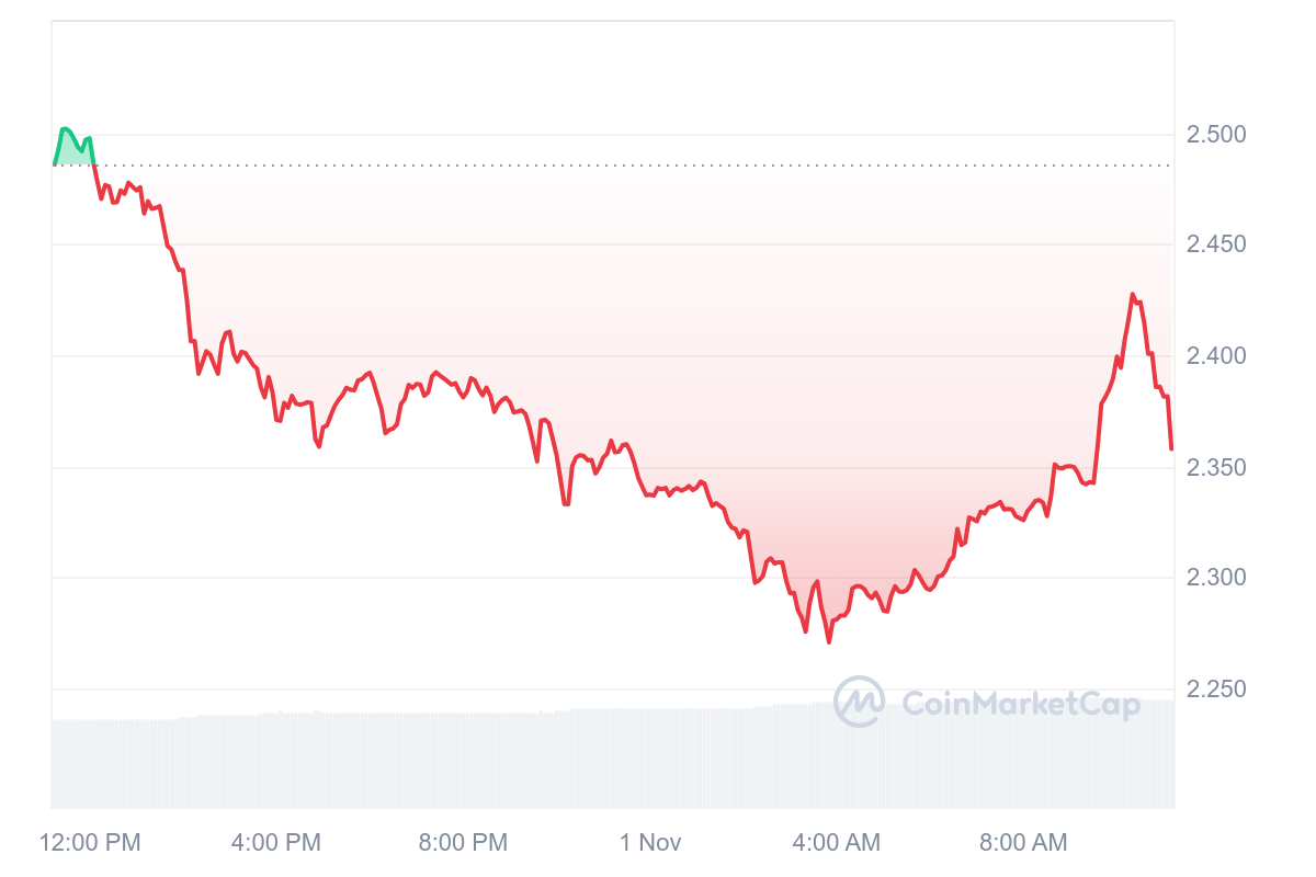 En raison de cette dernière baisse, le cours du WIF recule, et s’échange maintenant à un prix de 2,35 $. Le meme coin accuse une baisse journalière de 5,33 %.