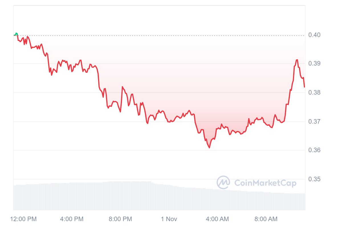 La chute du PYTH est progressive, et de même que la grande majorité des altcoins du marché crypto, un petit redressement de dernière minute n’a pas eu les conséquences positives espérées. Le PYTH s’échange à 0,382 $ après ce retracement de 4,66 %.