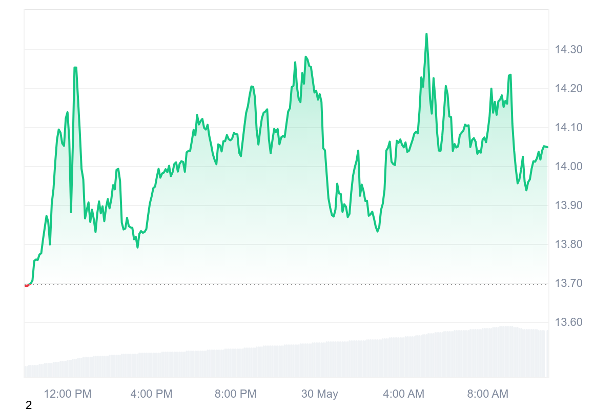 Le cours du DEXE gagne 2,08 % alors que sur la semaine, il s’agit d’un des seuls jetons en positif avec une hausse qui dépasse même les 10 %. Pendant ce temps, le jeton regagne les 14 $ et retrouve une once de sérénité.