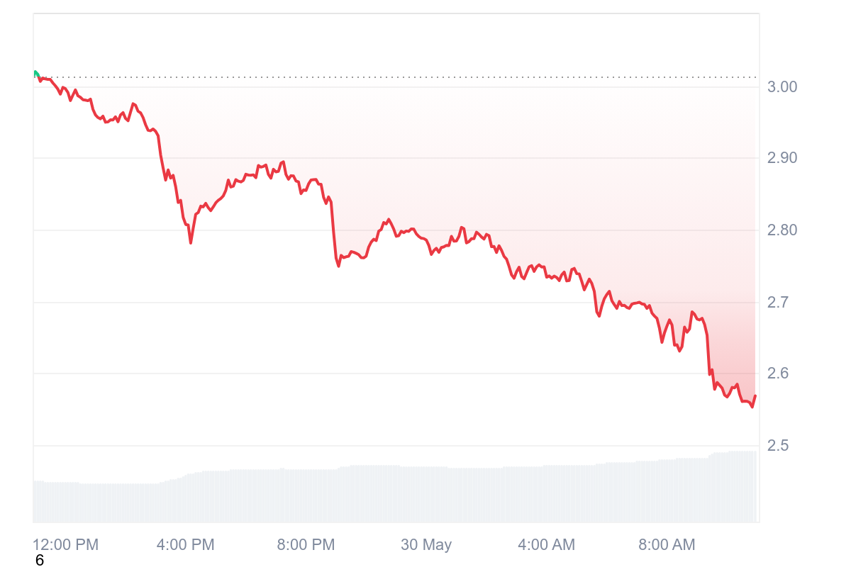 Coupable d’avoir effectué la pire performance du jour, le RAY de Raydium retrace de 14,91 % et abandonne totalement les 3 $. Désormais, la pièce se négocie à 2,57 $.