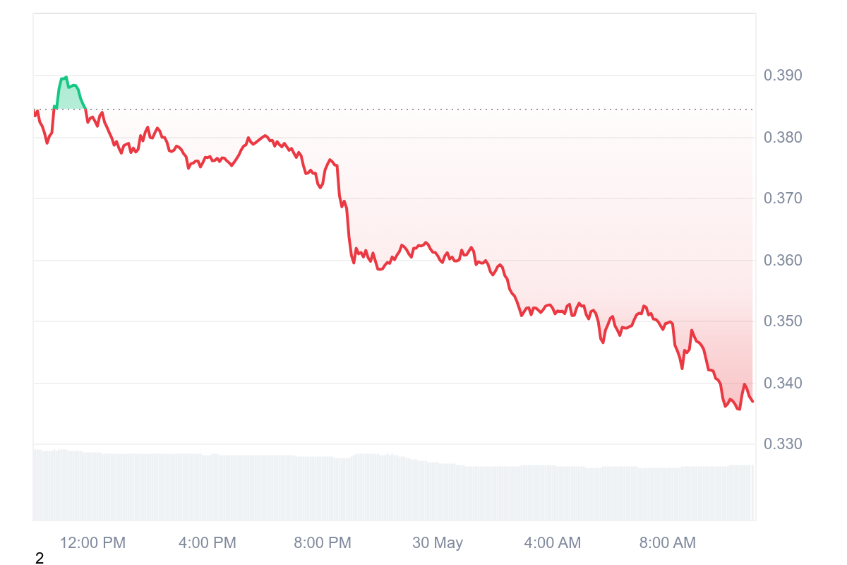 Le cours d’Ethena (ENA) a subi un recul brutal avec une perte de 13,50 % qui fait retomber le prix de l’actif à 0,337 $.