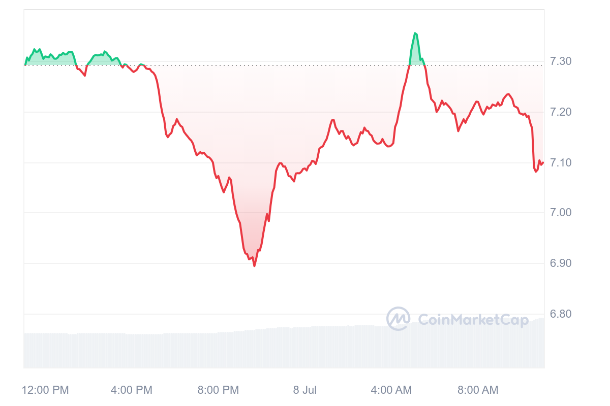 Le TON est resté tout au long de la journée dans le rouge, et même si les pertes sont maigres, ce n’est pas l’écosystème tout entier qui grimpe en flèche aujourd’hui. En conséquence, le TON perd 2,72 % avec un prix de 7,10 $.