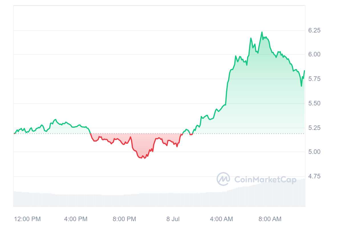 Sur les dernières 24 heures, le cours du TIA de Celestia s’est fortement revalorisé avec une hausse de 11,60 % qui propulse le prix du jeton à 5,82 $. Au meilleur de la journée, la pièce a même réussi à dépasser les 6 $.